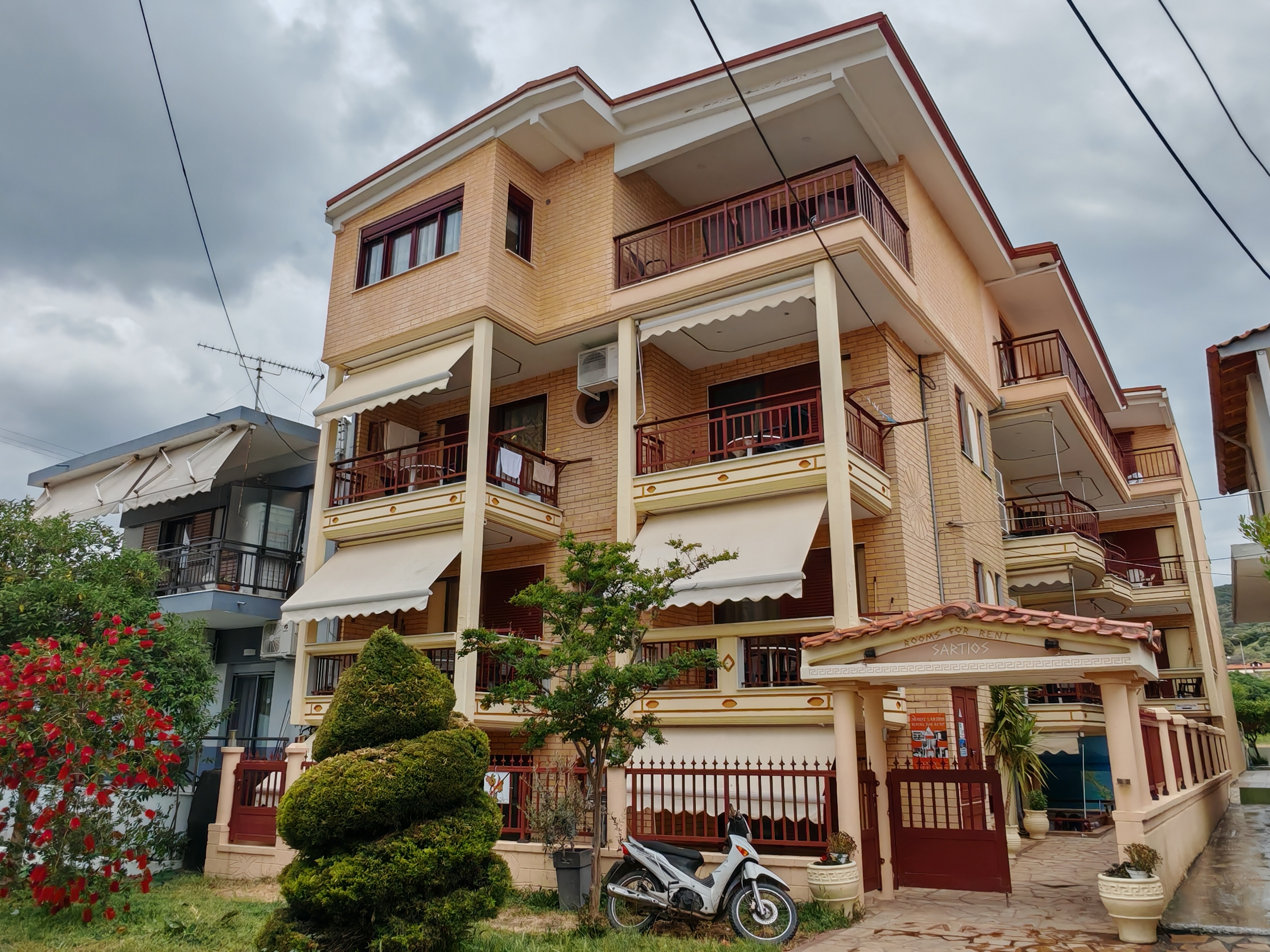 Fekvése: Sarti központjától kb. 80 méterre, a tengerparttól kb. 190 méterre épült hangulatos apartmanház. A település központjában üzletek, tavernák, éttermek, bárok és kávézók sokasága várja az idelátogató vendégeket.